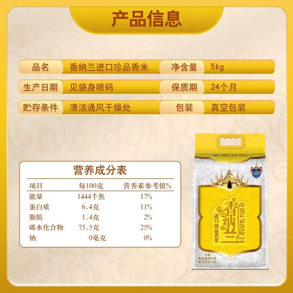 (中百)香纳兰进口珍品香米5kg原粮进口新米长粒香米