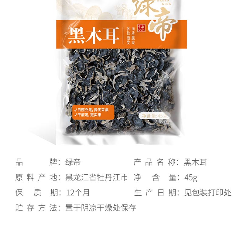 商品名称:(世星阳光) 绿帝黑木耳45g*3 东北土特产秋木耳黑木耳无根木耳南北干货新货凉拌木耳