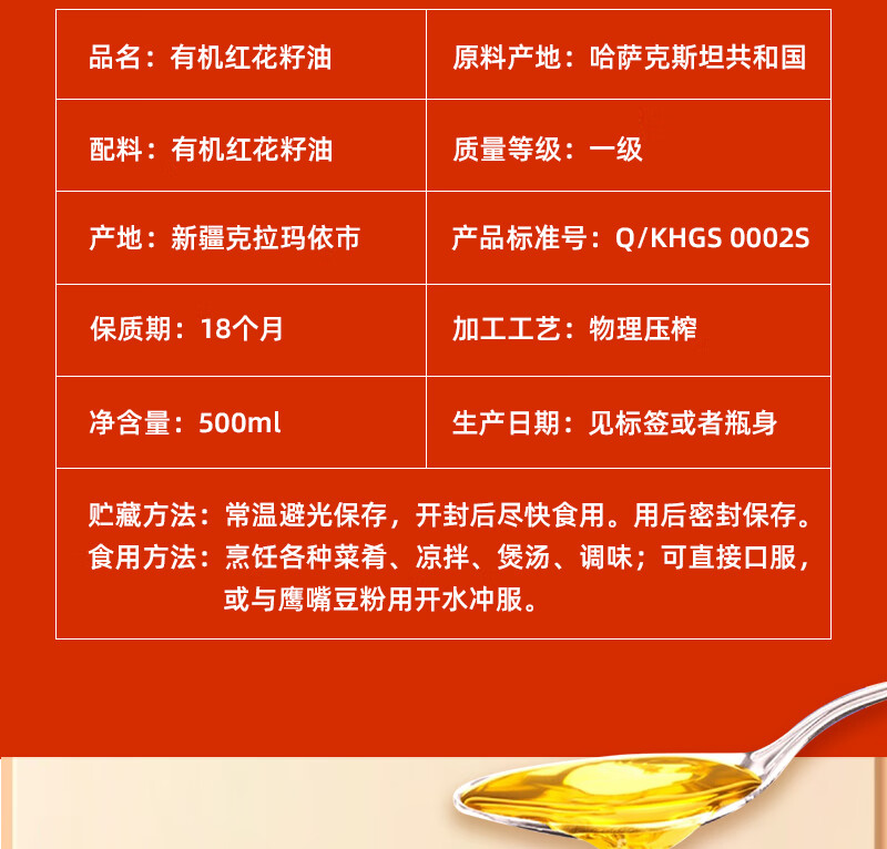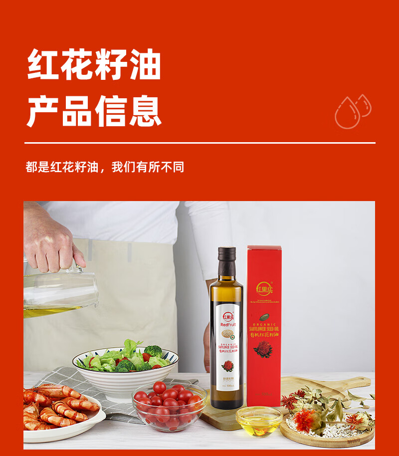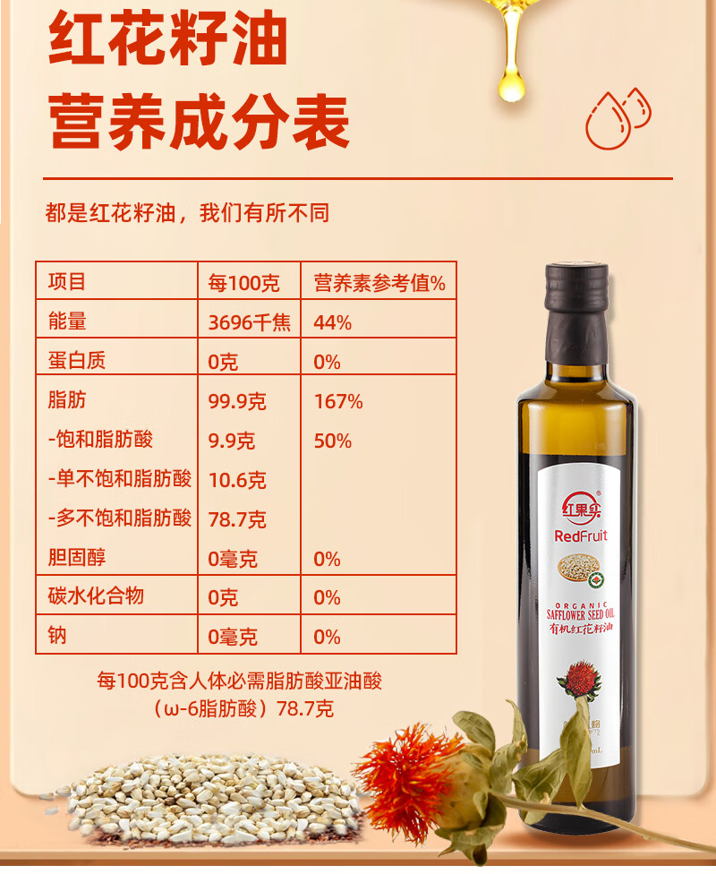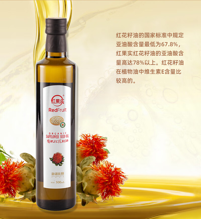 商品名称:(巨邦佑)BJ+红果实有机红花籽油500ml 新疆玻璃瓶食用油礼盒物理压榨