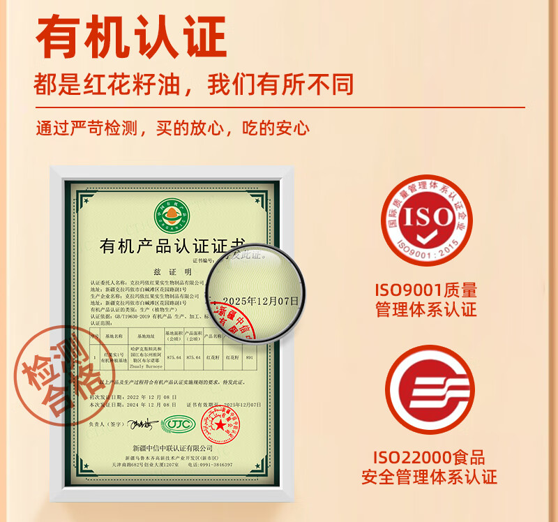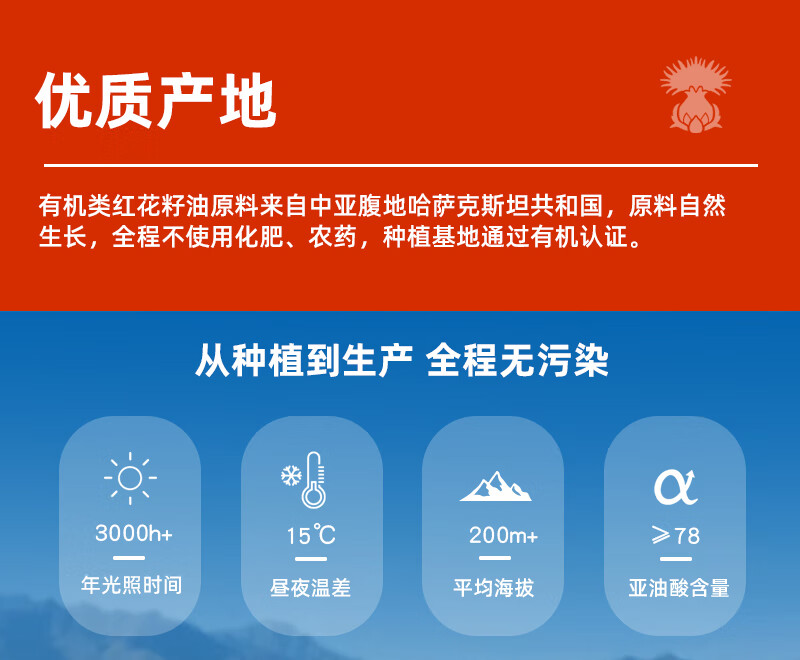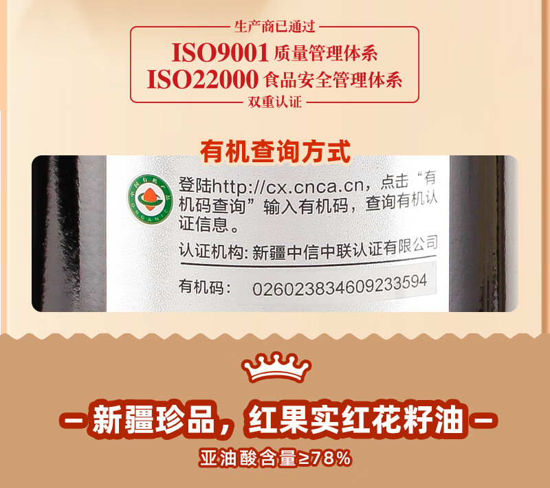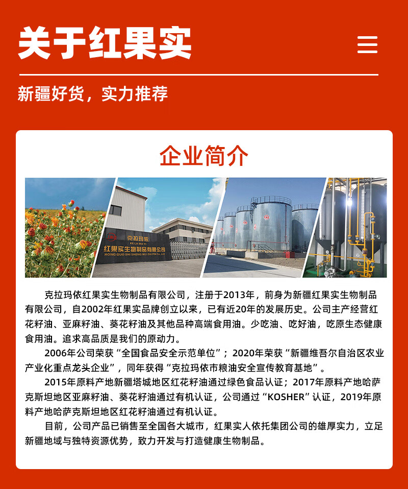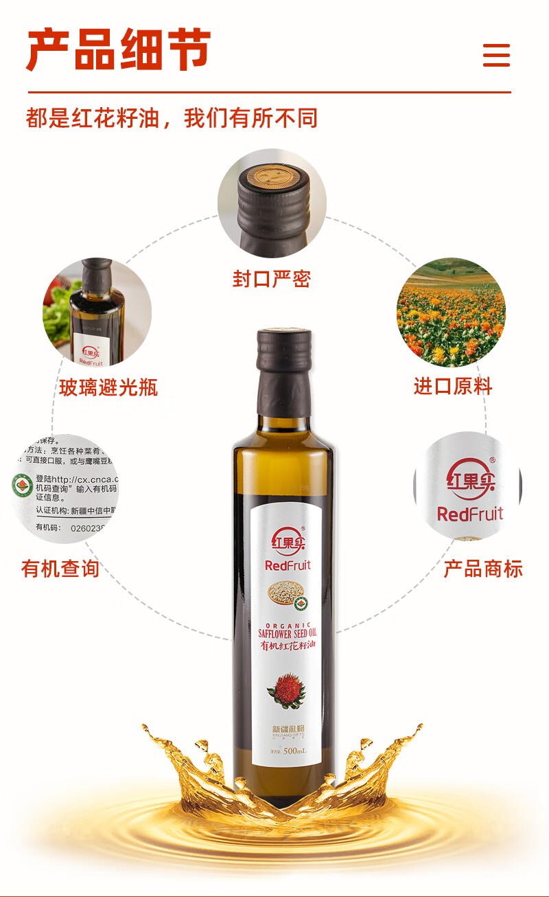 商品名称:(巨邦佑)BJ+红果实有机红花籽油500ml 新疆玻璃瓶食用油礼盒物理压榨