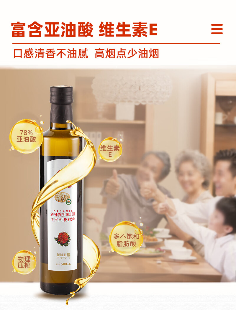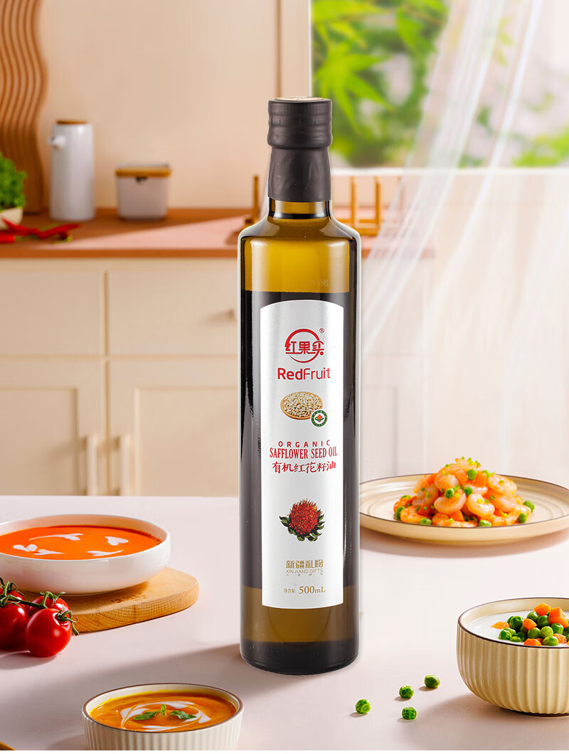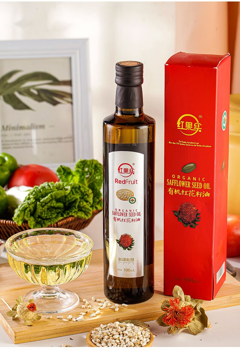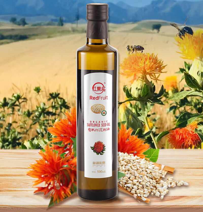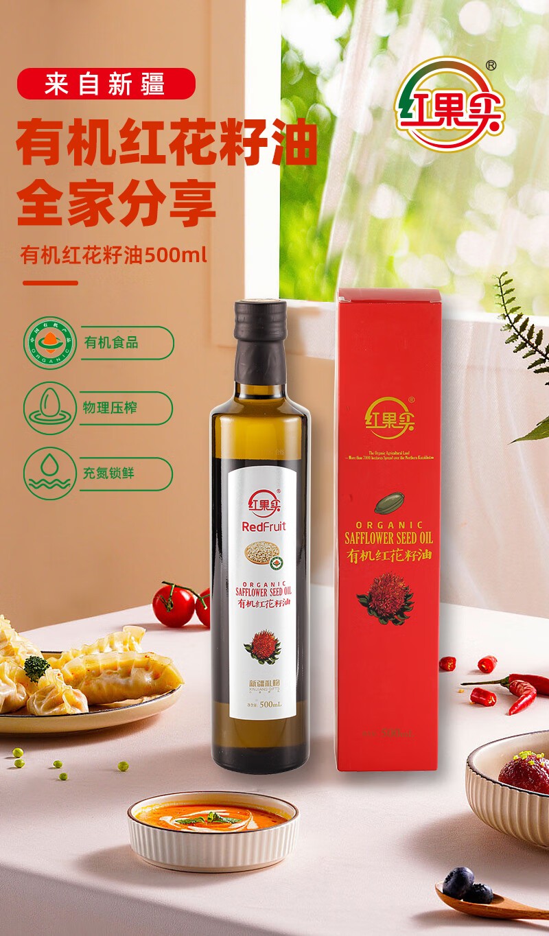 (巨邦佑)BJ+红果实有机红花籽油500ml 新疆玻璃瓶食用油礼盒物理压榨