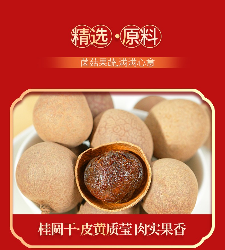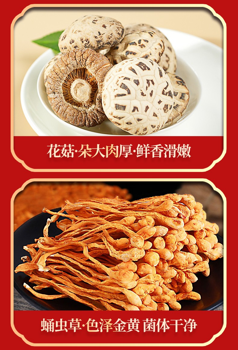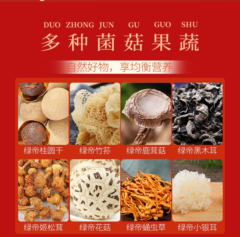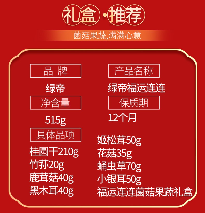 商品名称:(巨邦佑)T+绿帝福运连连菌菇果蔬礼盒515g(桂圆干210g、竹荪20g、鹿茸菇40g、黑木耳40g、姬松茸50g、花菇35g、蛹虫草70g、小银耳50g)