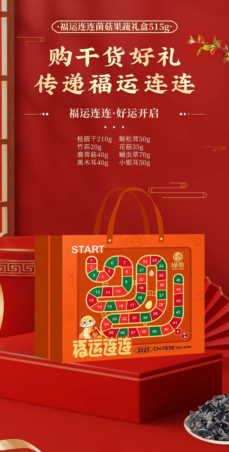 (巨邦佑)T+绿帝福运连连菌菇果蔬礼盒515g(桂圆干210g、竹荪20g、鹿茸菇40g、黑木耳40g、姬松茸50g、花菇35g、蛹虫草70g、小银耳50g)
