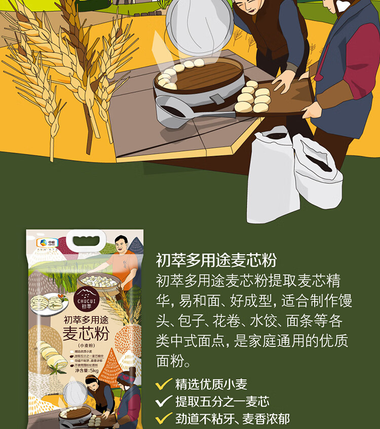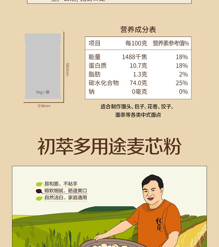 商品名称:(中合誉品)初萃多用途麦芯粉5kg 馒头包子面条饺子通用 中筋小麦面粉