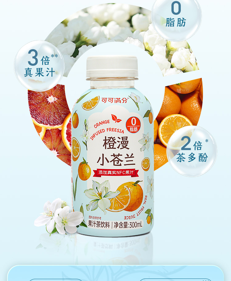 商品名称:(世星阳光)可可满分橙漫小苍兰 300ml×3瓶×2组(6瓶)3倍真果汁 2倍茶多酚 零脂
