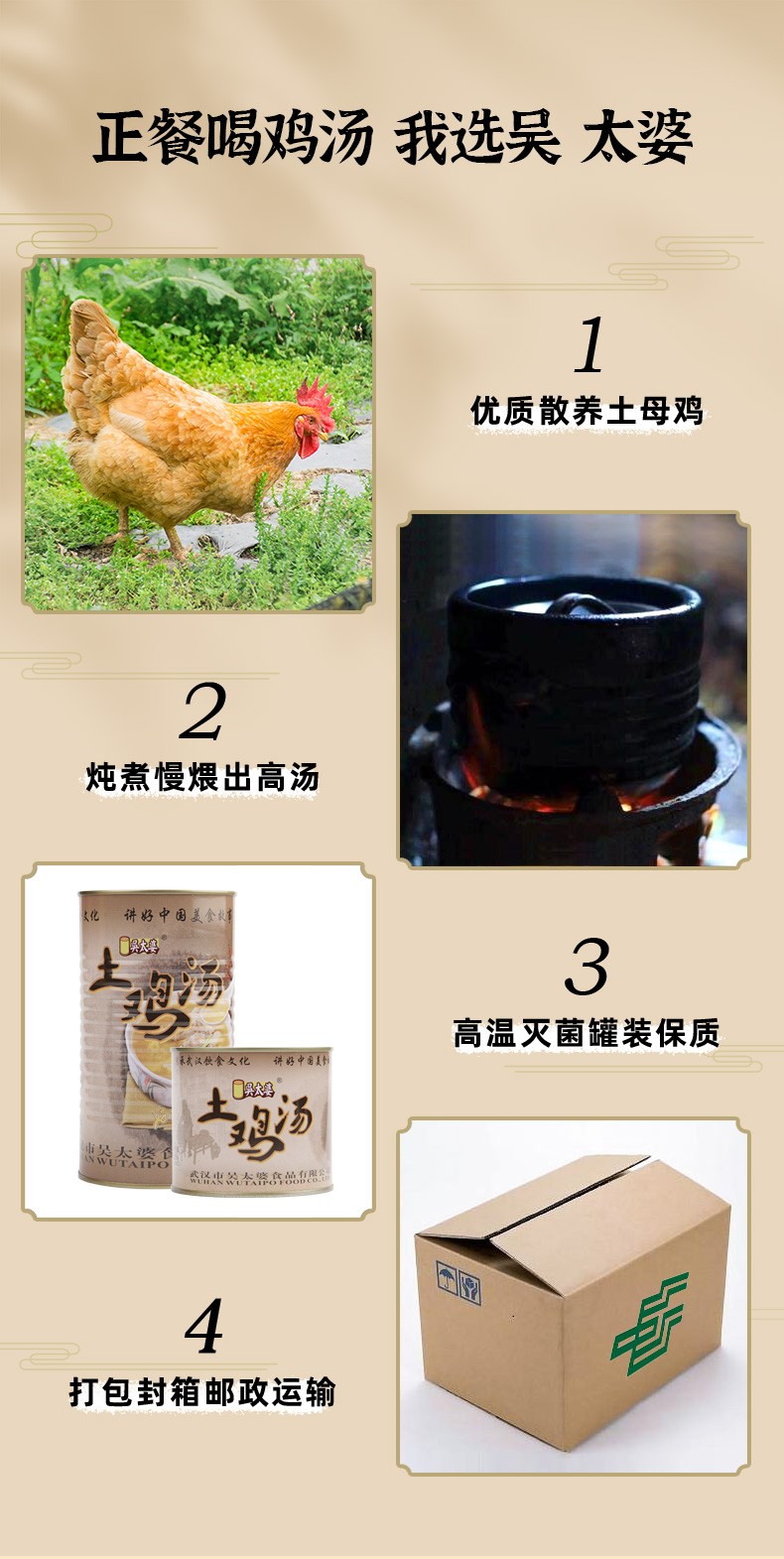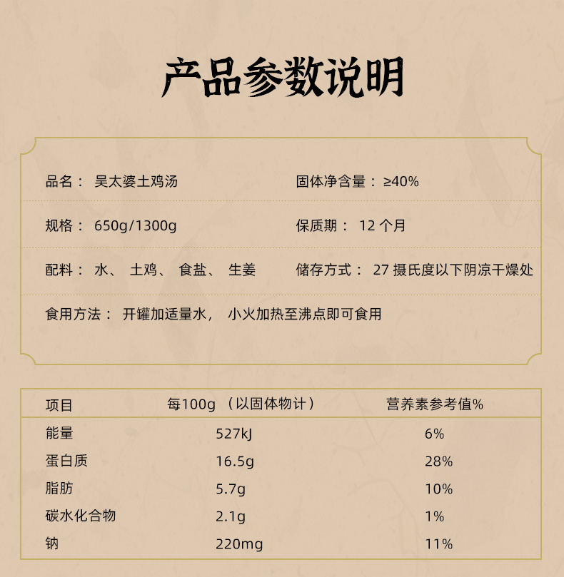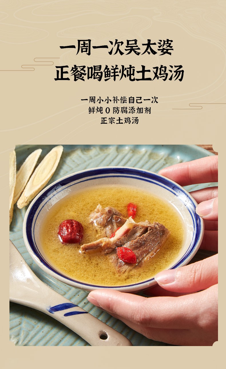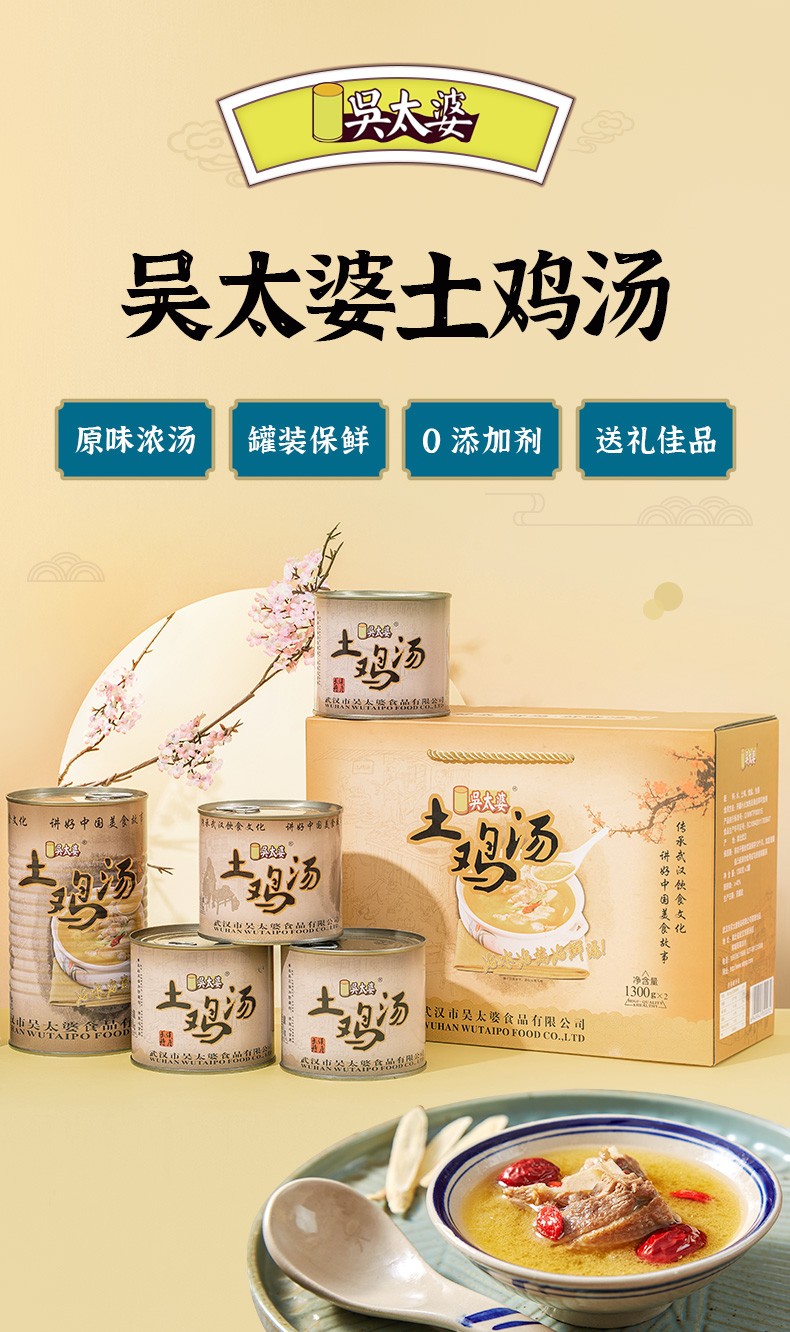 商品名称:(世星阳光) 吴太婆 土鸡汤650g/1300g/1900g 营养美味性温滋补 原味浓汤 罐装保鲜 0防腐剂