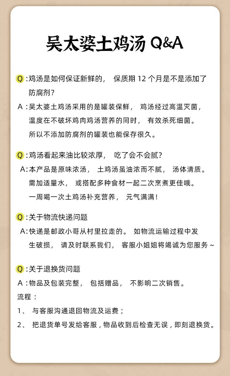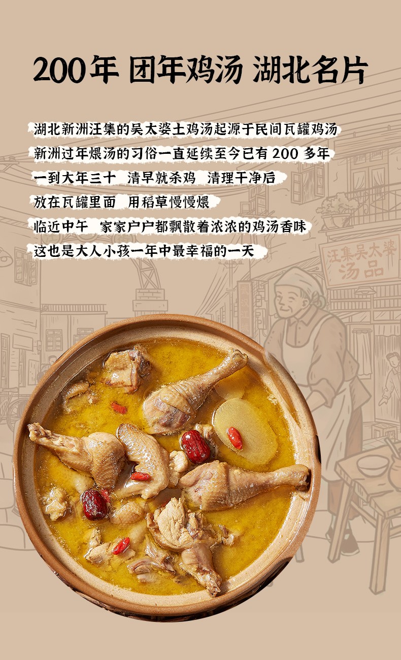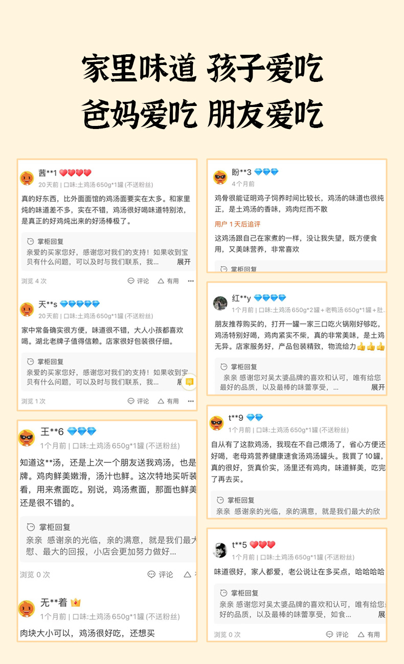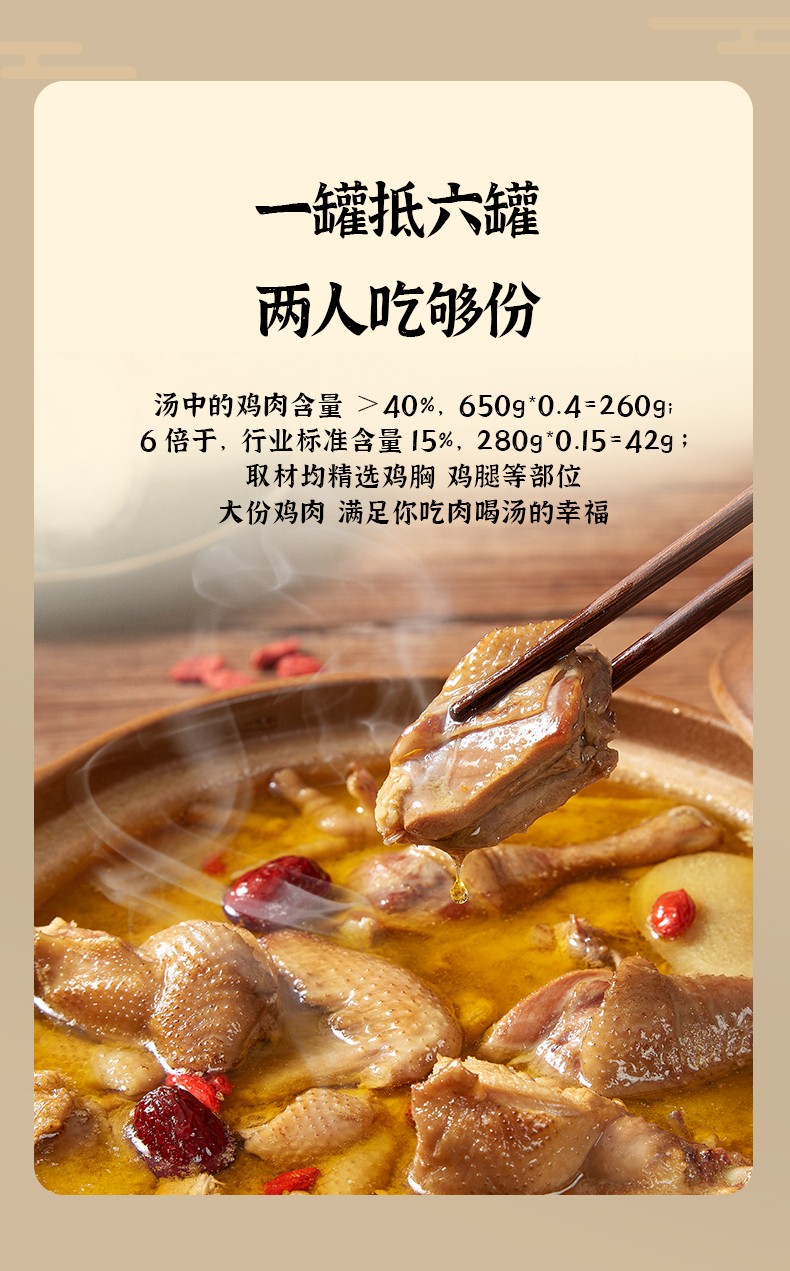 商品名称:(世星阳光) 吴太婆 土鸡汤650g/1300g/1900g 营养美味性温滋补 原味浓汤 罐装保鲜 0防腐剂