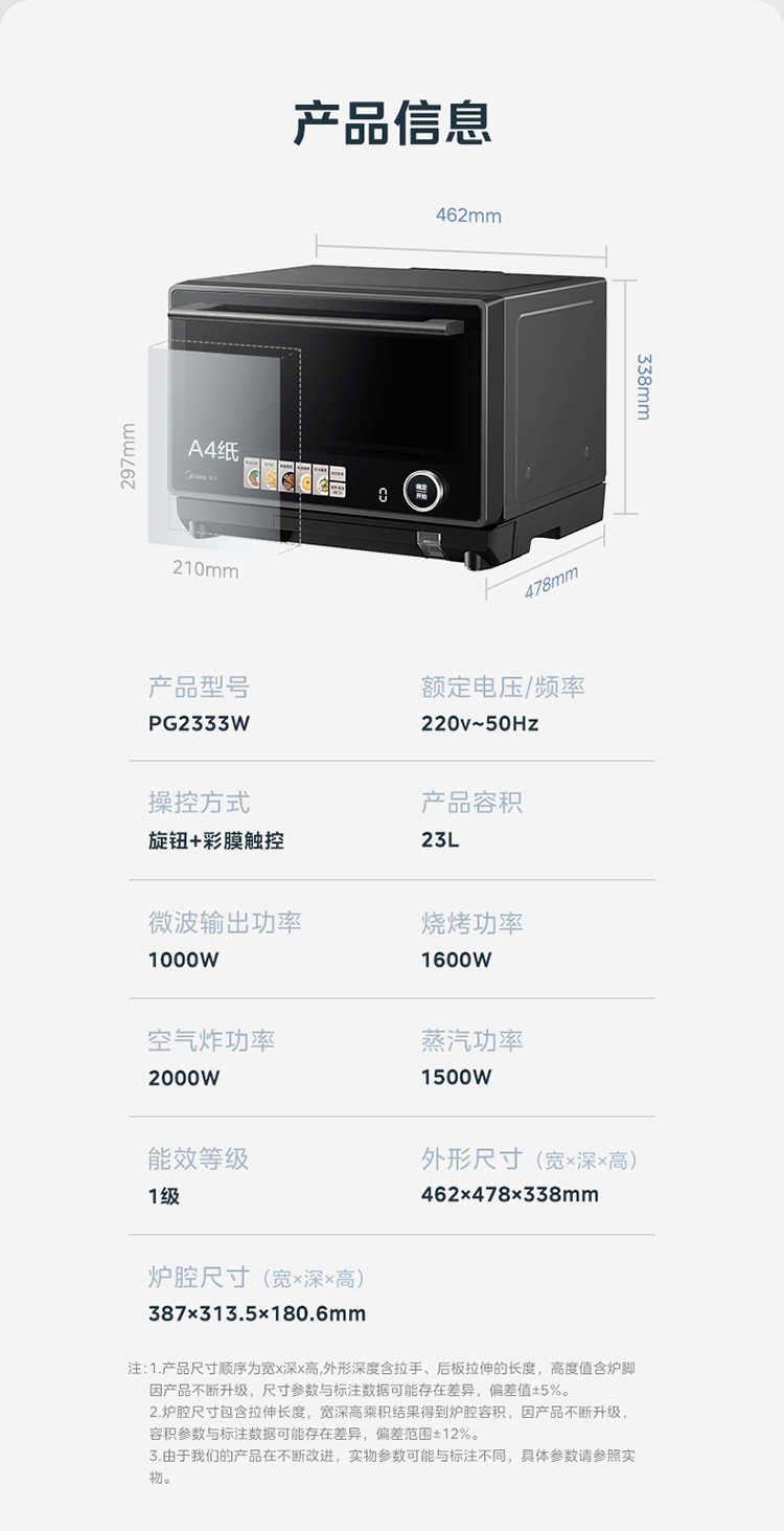 商品名称:(巨邦佑)R+美的(Midea)寻味系列 变频微波炉PG2333W 家用微蒸烤炸四合一 旋钮触控操作简单精准控温智能菜单一键解冻