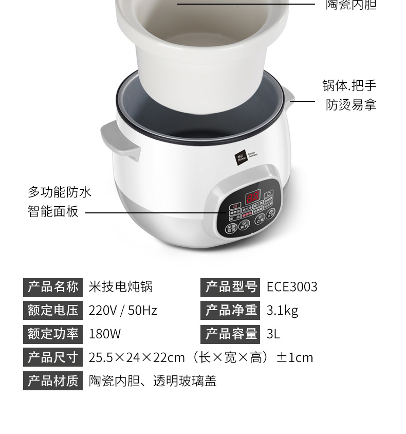 商品名称:(巨邦佑)BJ+米技 微电脑多功能电炖锅ECE3003 3L家用慢炖锅多功能