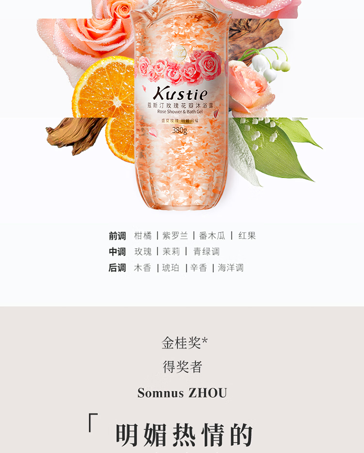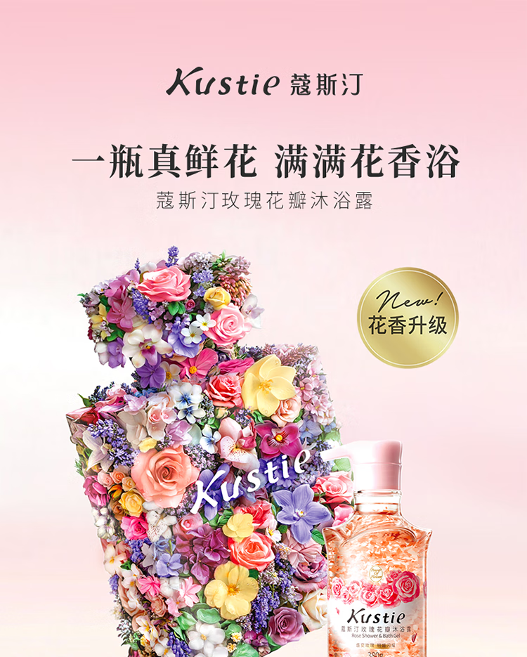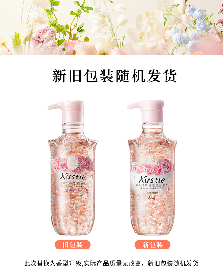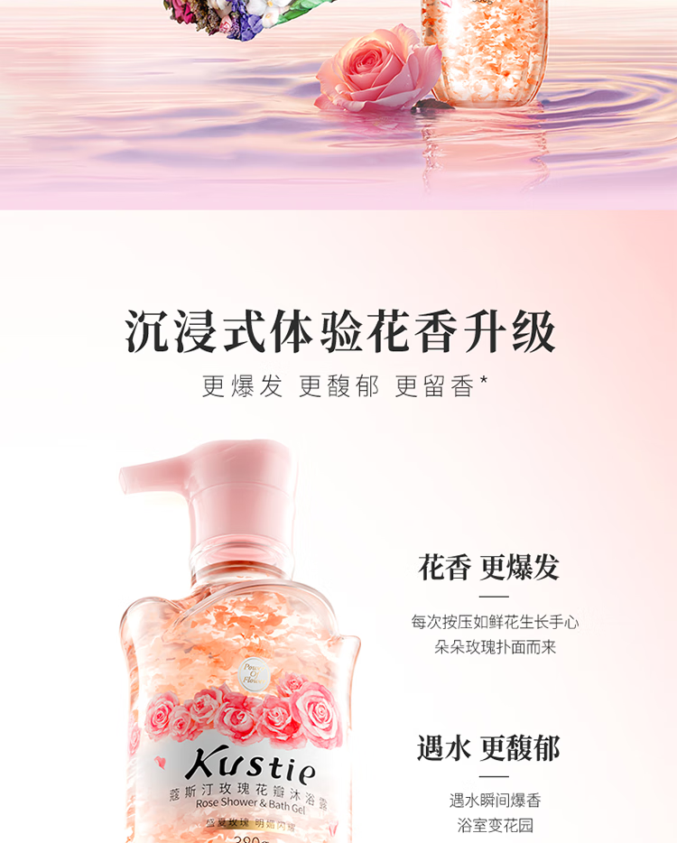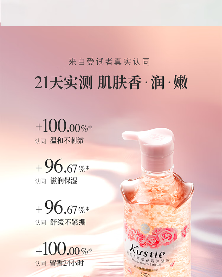 商品名称:(巨邦佑)R+蔻斯汀 Kustie 新升级玫瑰花瓣沐浴露380g*2瓶 香氛沐浴泡沫丰富