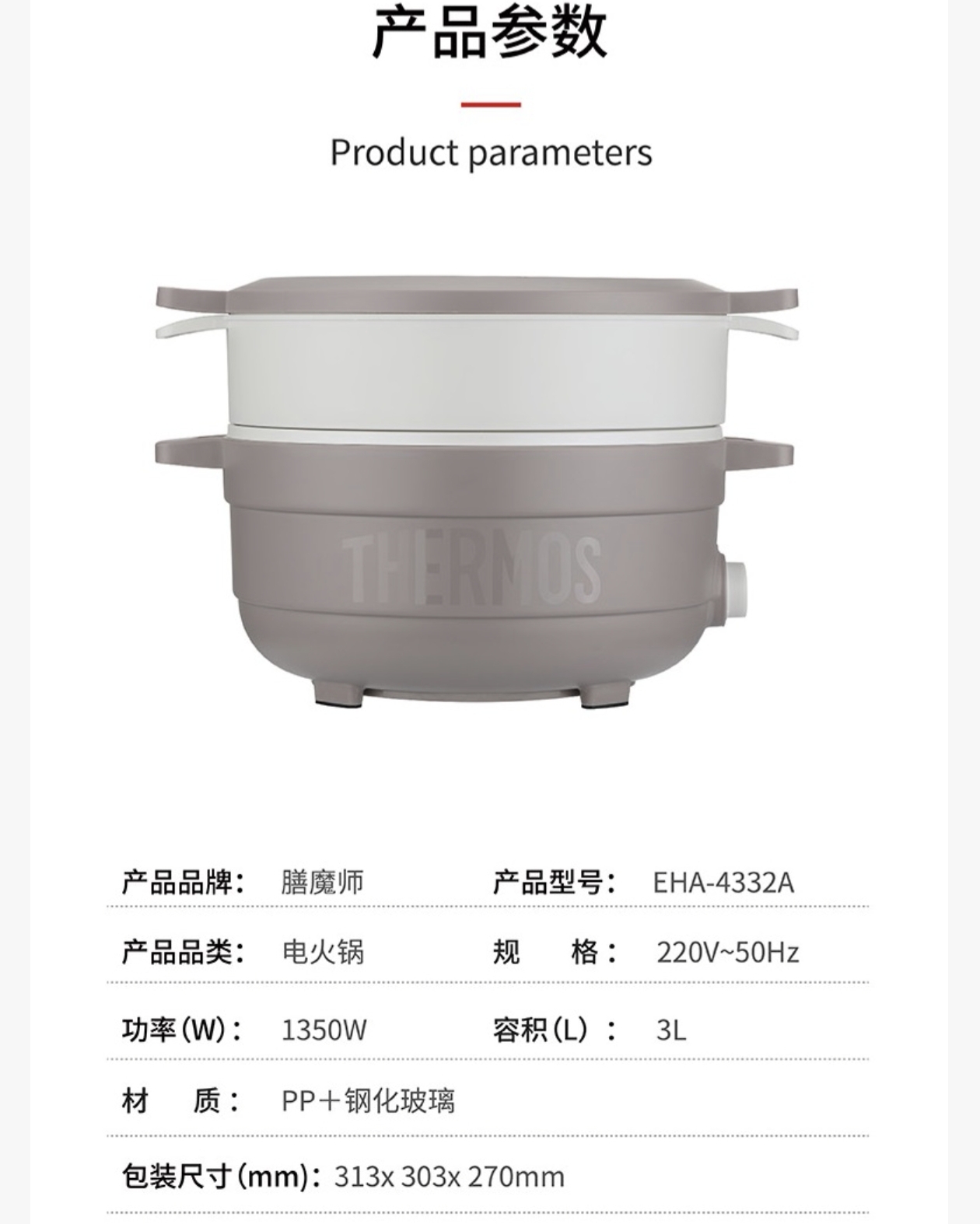 商品名称:(巨邦佑)T+膳魔师多功能电煮锅EHA-4332A 3L 上蒸下煮电热火锅不粘锅防干烧