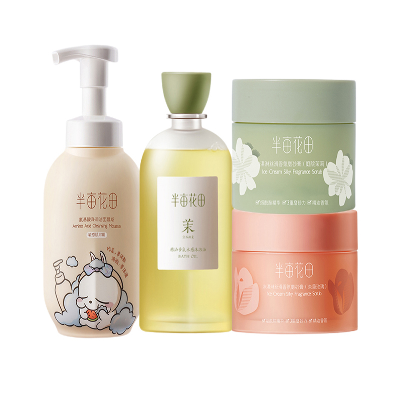 商品名称:(世星阳光)+半亩花田净润氨基酸洁面沐浴油磨砂膏四件套KJ09 沐浴油400g 磨砂膏250g*2 洁面慕斯300ml 科学洗脸 分肤清洁 橄榄油控油款 洗后更清爽