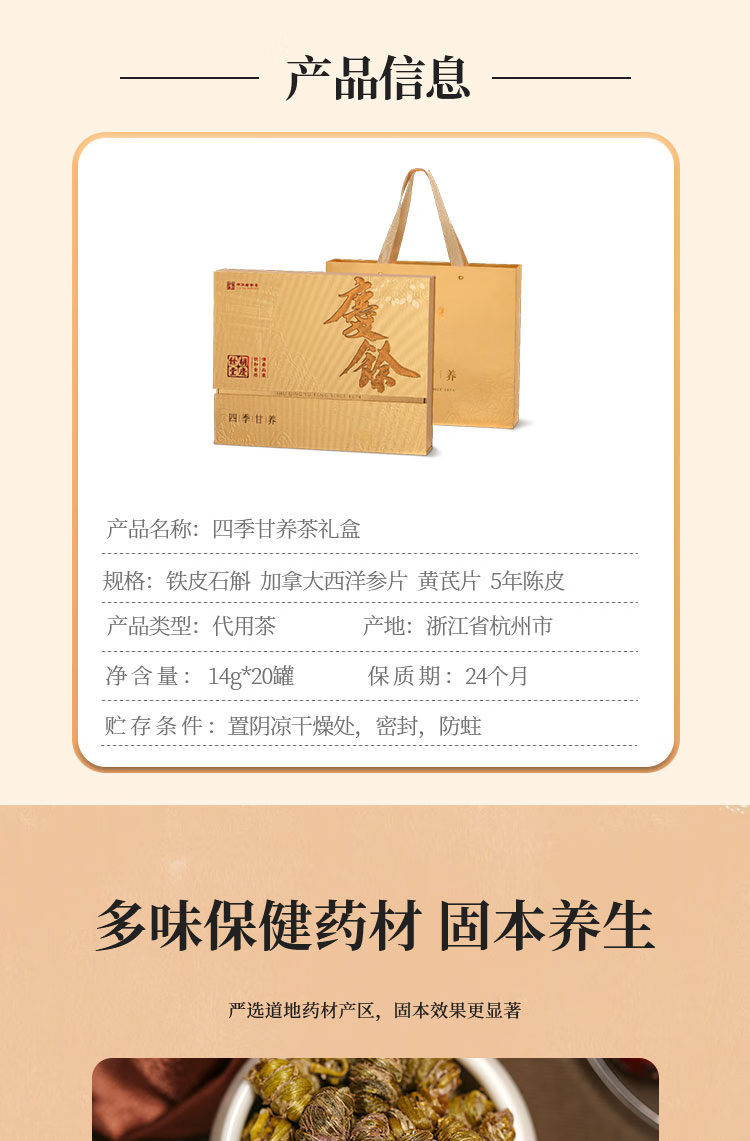 商品名称:(巨邦佑)R+胡庆余堂四季甘养茶礼盒14g*20罐 实用高档礼盒套装 孝敬长辈 正宗原装
