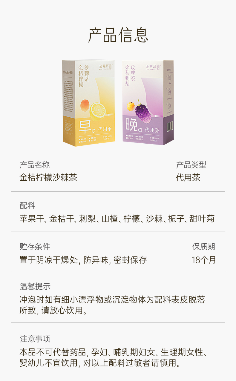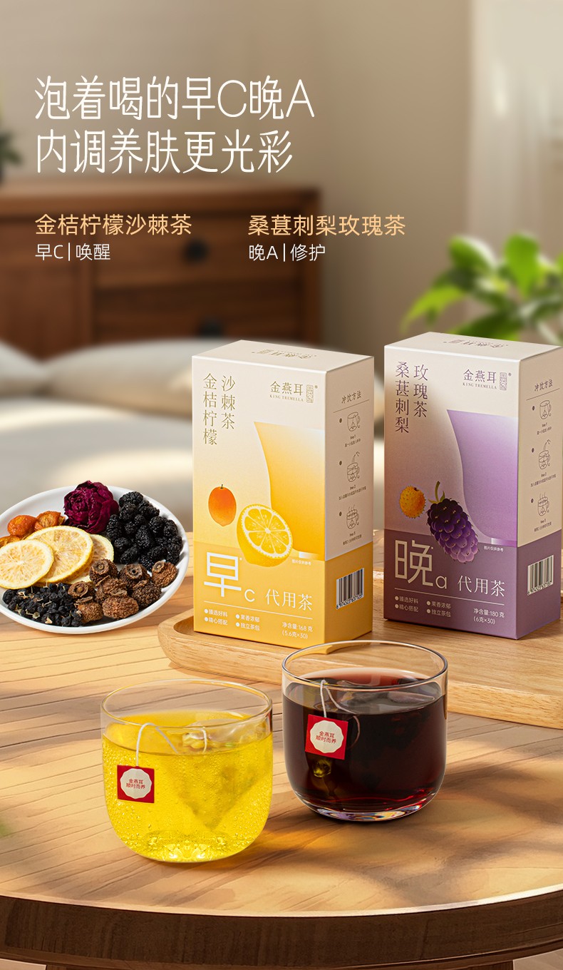 商品名称:(汇景缘)金燕耳K早C晚A代用茶 【早C唤醒】金桔柠檬沙棘茶30小袋盒【晚A修护】桑椹刺梨玫瑰茶30小袋盒