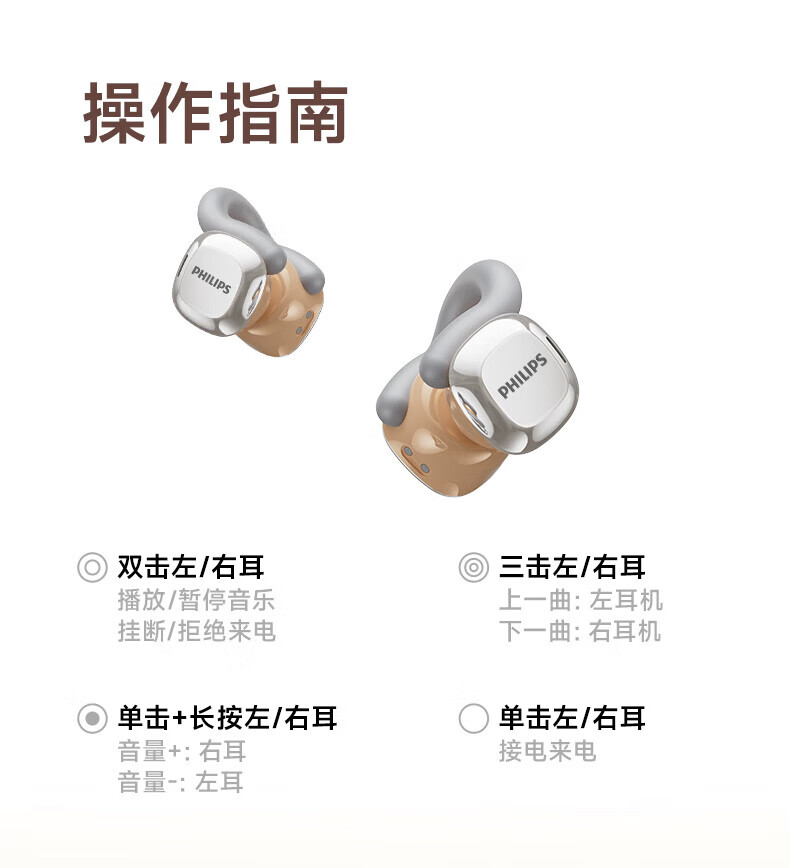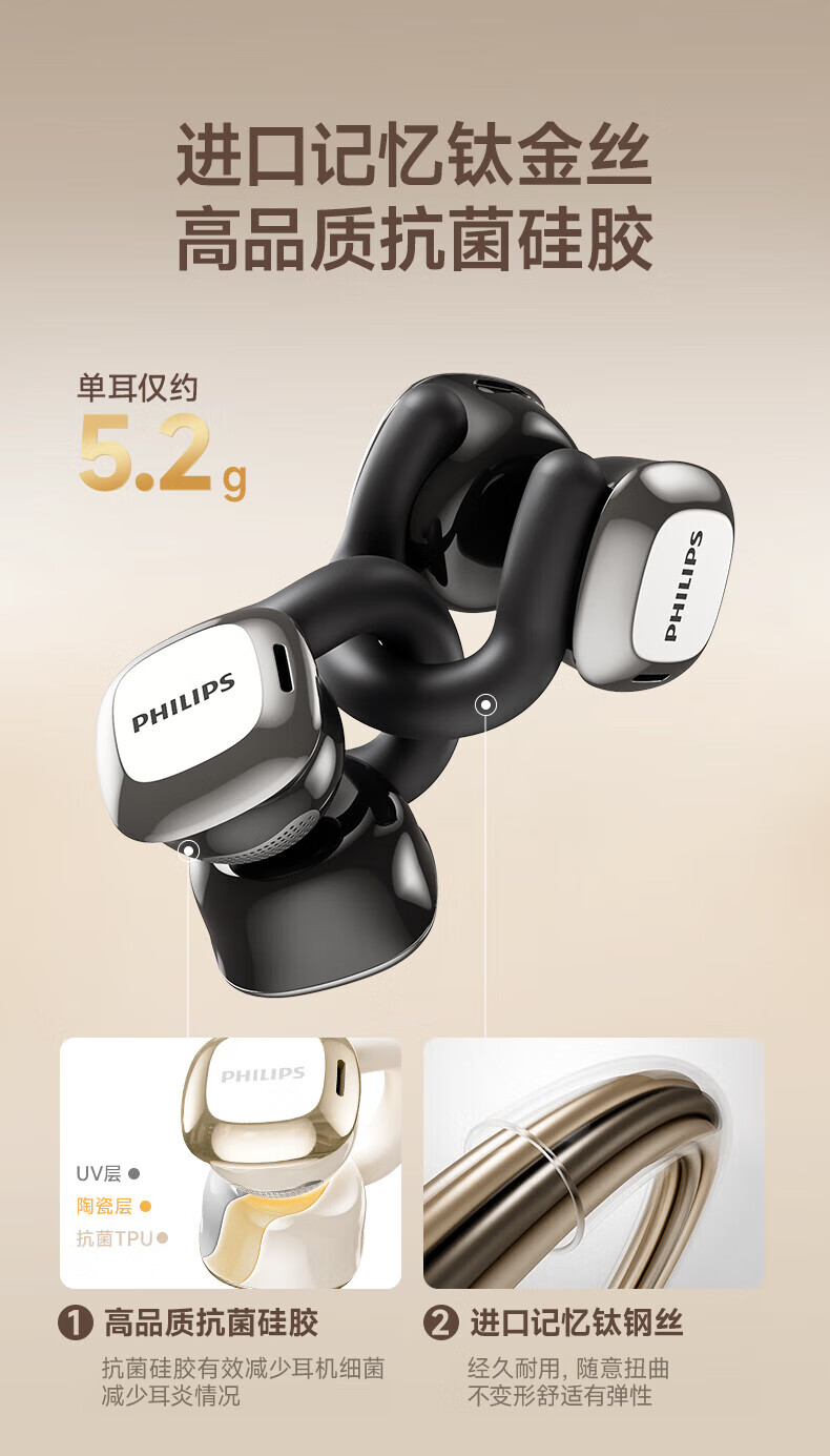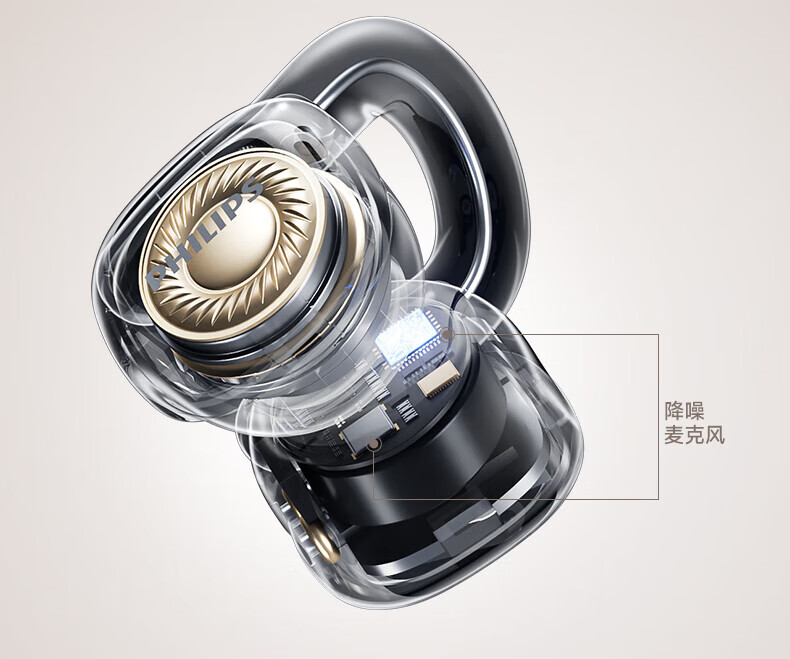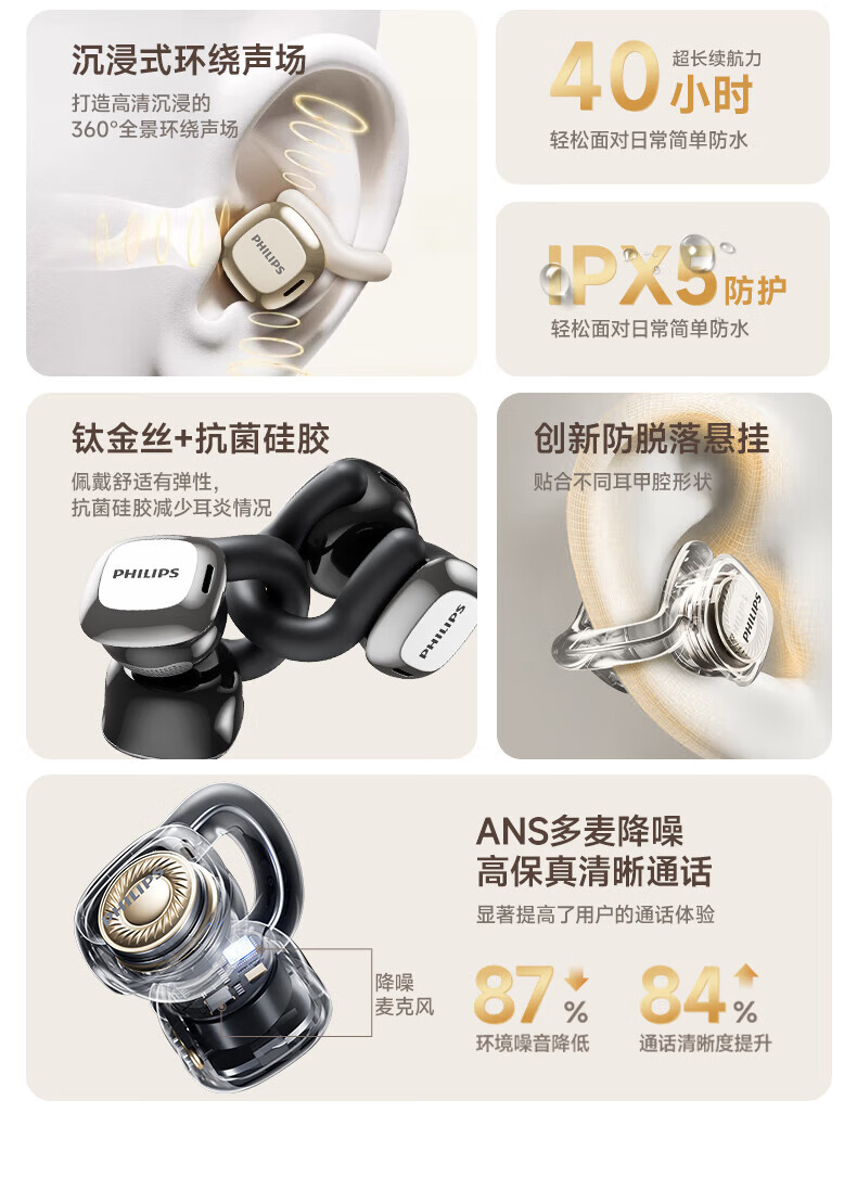 (巨邦佑)BJ+飞利浦 耳机 TAQ4220 耳夹式真无线开放挂耳式骨传导概念不入耳运动跑步通话降噪适用于华为苹果 柔软佩戴智能动态降噪