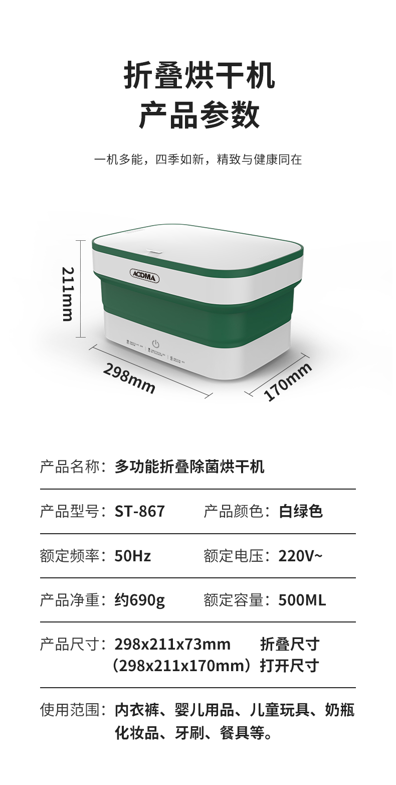 商品名称:(巨邦佑)BJ+澳得迈 多功能折叠除菌烘干机 ST-867 UV紫外线净化杀菌三重加热烘干模式母婴适用