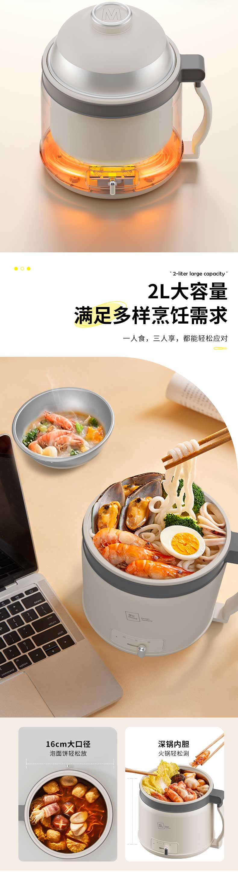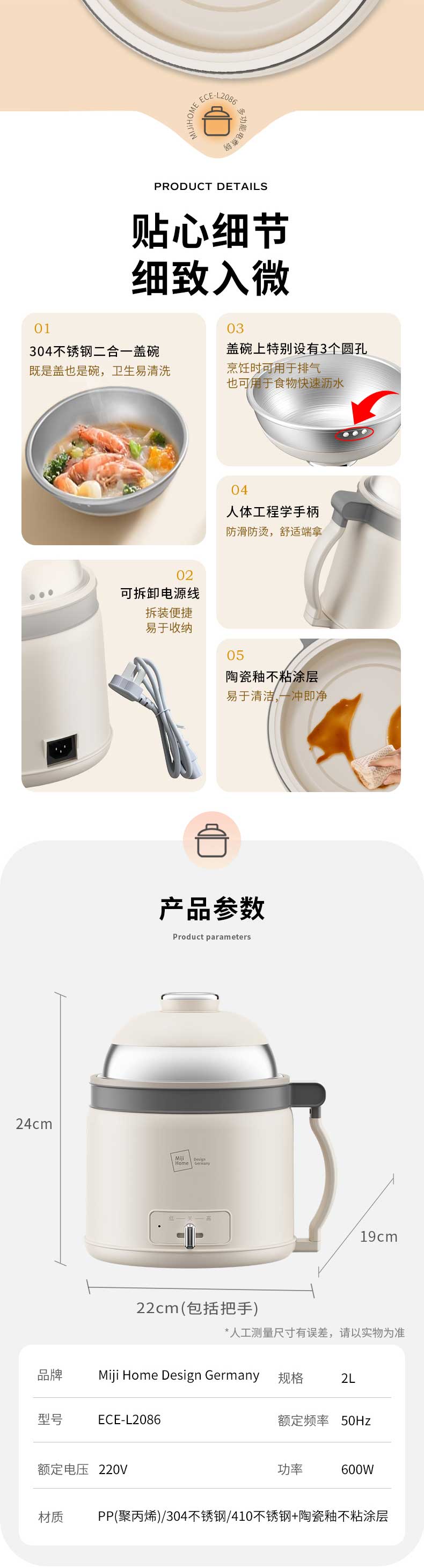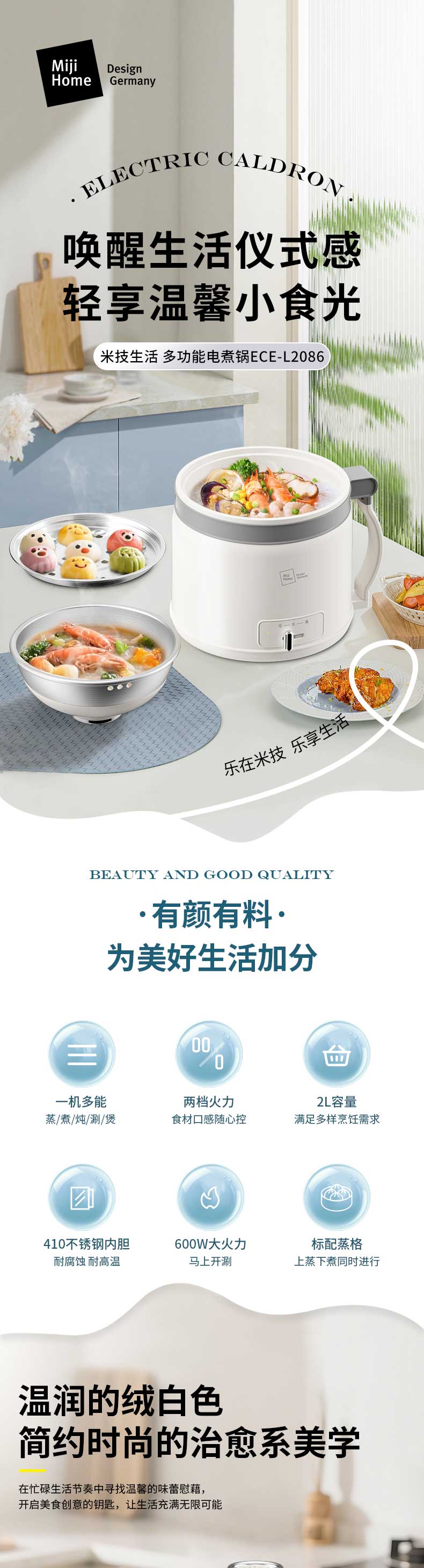 商品名称:(世星阳光)+米技(MIJI)多功能电煮锅ECE-L2086 温润的绒白色简约时尚的治愈系美学 集蒸 煮 炖 涮 煲 火锅等多种功能于一身