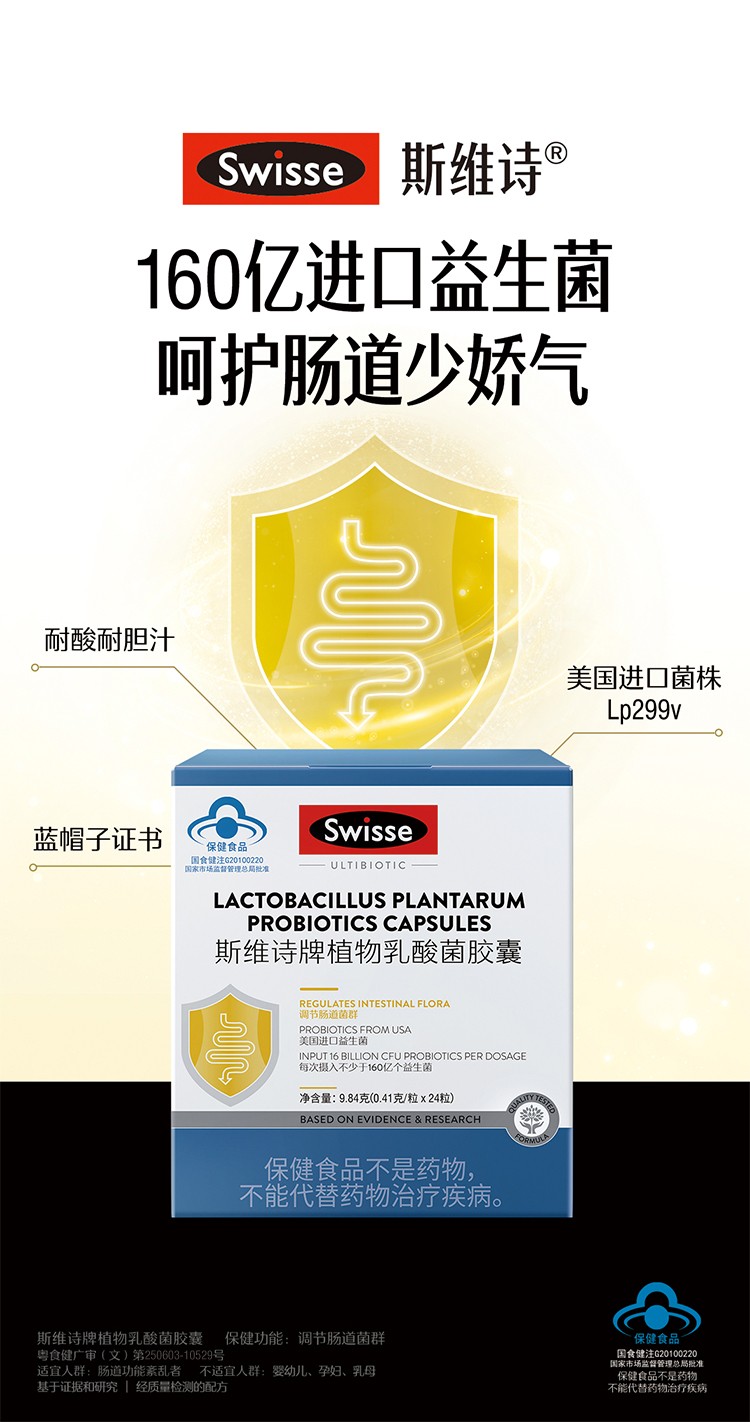 (超运·禾贸)Swisse斯维诗 植物乳酸菌胶囊 0.41gx24粒 160亿益生菌 平衡肠道菌群 美国进口益生菌株 成人适用 蓝帽认证