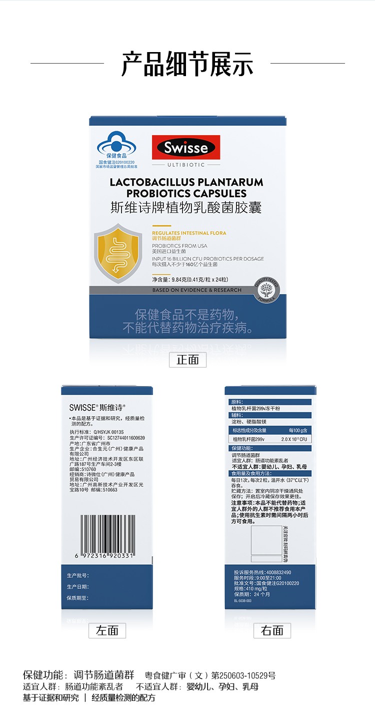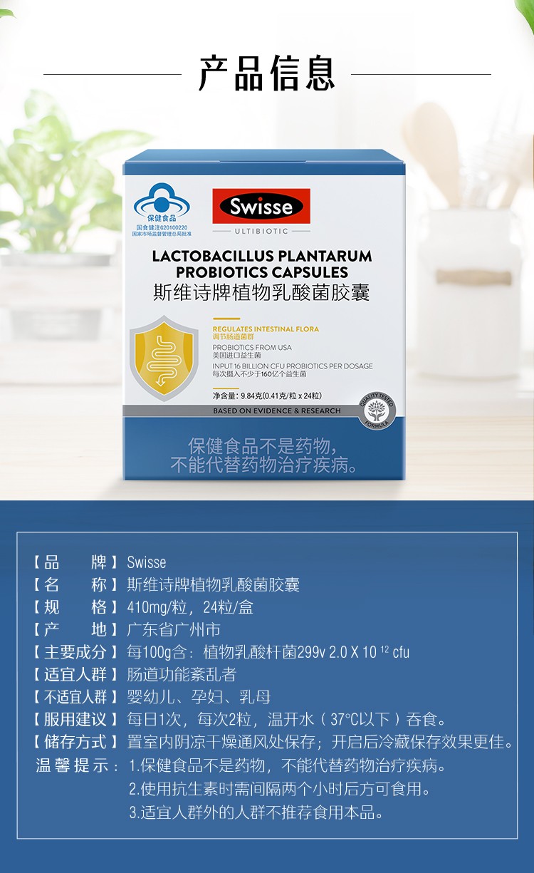 商品名称:(超运·禾贸)Swisse斯维诗 植物乳酸菌胶囊 0.41gx24粒 160亿益生菌 平衡肠道菌群 美国进口益生菌株 成人适用 蓝帽认证